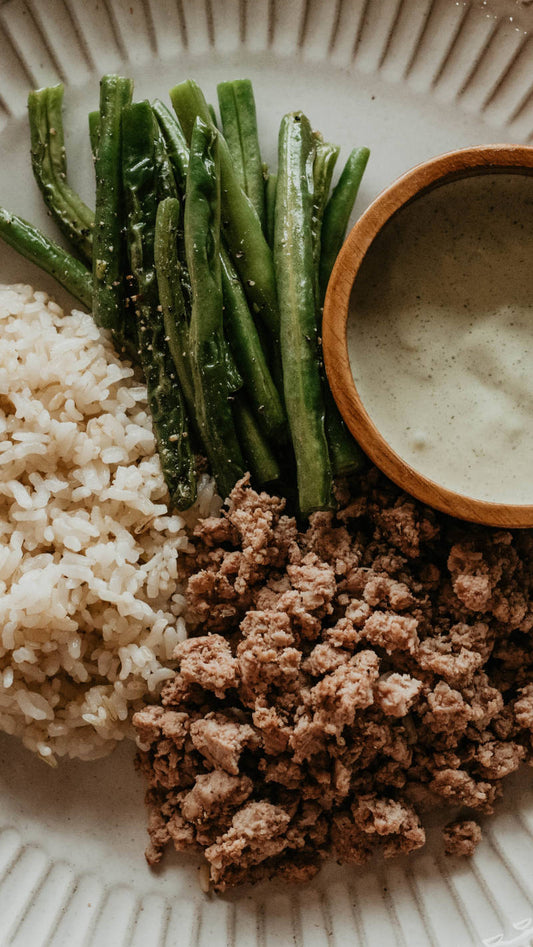 Seasoned Ground Turkey with Green Beans, Rice and Creamy Cilantro Ranch